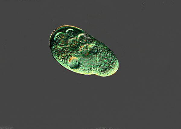 3. Colpidium sp. This is also a very common organism and cultures readily. It is important because it can be used as a food organism for many other larger ciliates. The color here is a consequence of Nomarski differential interference contrast.