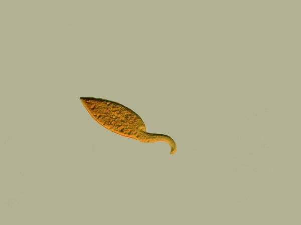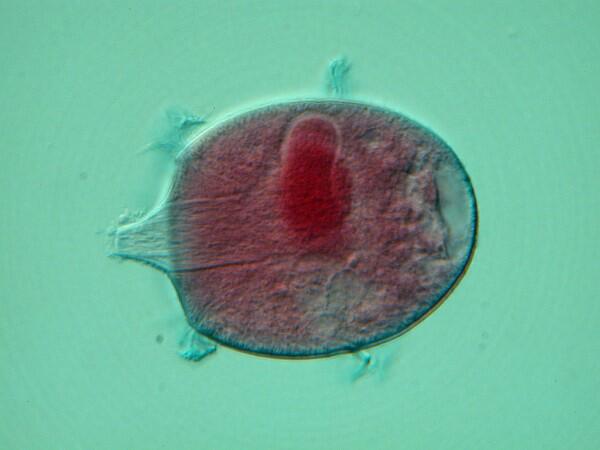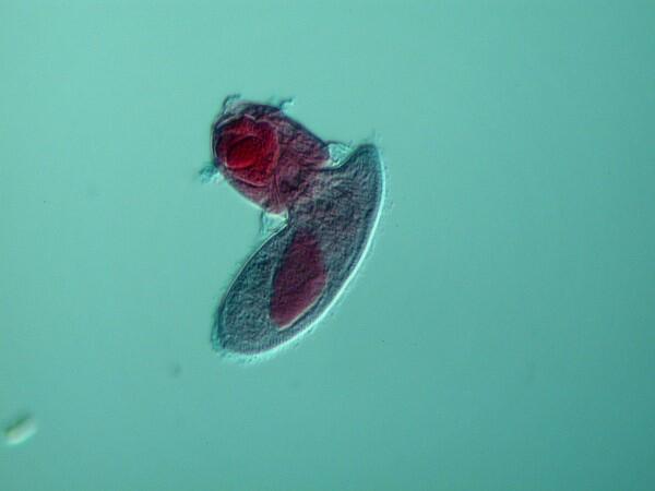 11. Stentor coeruleus. This species has a distinctive dichroic pigment which usually gives it a blue-green appearance, however, when the light shifts to just the right angle, the organism takes on a rose-colored tint. This specimen was swimming and is not fully extended.