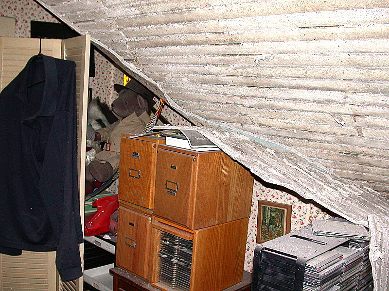 I’m sure that many of you have had the maddening experience of having your computer crash and unless you are remarkably scrupulous, have lost some data as a consequence. Well, I had a computer crash in a very unexpected fashion a few years ago. I was sitting up in my study on the second floor of our old house (a bit over 120 years old then–the house not me), when I heard a strange creaking sound and then suddenly part of the ceiling started raining down on my computer, me, and the microscope setup which I had for doing photomacrography. I sat there absolutely stunned. The debris consisted of lath and plaster which was apparently the fashion in olden days. I’ll show you five pictures just to convince you that I’m not making this up.