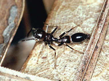 The similarity between some jumping spiders and ants, velvet ants or beetles can be startling. While some are apparently generalized primitive (ponerine) ant mimics, Synemosyna (as noted earlier) closely resembles the ant genus Pseudomyrmex, another looks much like a dolichoderine (stingless) ant, and another looks much like arboreal ants in the genus Crematogaster. It is easy even for a specialist to be fooled by Synemosyna. Apparently their predators are easily fooled into treating them as ants, and at least some ants sting or are unpalatable. Some of the ponerines are, in fact, somewhat dangerous, as their stings, at least in some tropical species, can cause temporary paralysis. What seems odd is that there are apparently no jumping spider mimics for the fierce harvesting ants of the western United States. However, this may only be a result of a lack of species with the genetic ability to look like these ants, more than from lack of a niche for such a species. As it turns out, jumping spiders may have simply missed a few chances to take advantage of such opportunities, although the ones they did take advantage of are certainly impressive.
