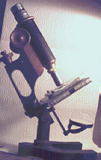 I use a second-hand microscope bought at a yard sale for five dollars, which I have now repaired (shown right). The eyepiece, objective lenses and part of the stage assembly have been cobbled together from parts of other microscopes etc. It had been clearly neglected but once it was cleaned and oiled, the mechanics - especially the coarse and fine focus, proved to be one of the best I have encountered. It's a pity it didn't come with its original lenses but it works like a charm and I can even make out individual bacteria cells with it. (By the way, can anyone identify when this particular instrument by Bausch and Lomb was made? I sure would like to know.)