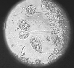 Pictures taken with the microscope set-up are a bit on the blurry side, but I have improved the results using the sharpening filter in 'Paint Shop Pro'. Also the color balance is off but that appears to be a result of the low light used i.e. an ordinary desk lamp. The microscope has no iris diaphragm or condenser to adjust the lighting, but you can still make out many of the details in subjects like pond life. Even the thin hair-like stalks of the bell animal (Vorticella?) shown below when photographed alive are visible.