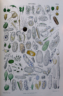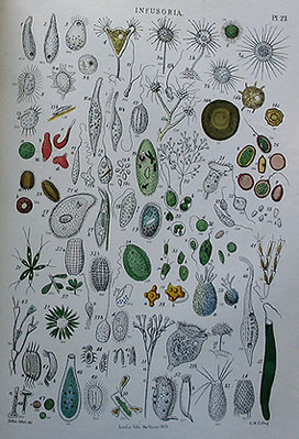 I love old books and especially old microscopy books. My brother and I have been fortunate enough to acquire quite a few of the more commonly found microscopy books over a number of years dating between the late 19th and early 20th centuries some of which are still available through the Internet, for example through Savona Books UK or the Abebooks network, but be warned...some are now getting expensive. Many of the names given to the microscopic animals and plants studied by the Victorian microscopists have changed, but to me this is irrelevant since I particularly admire the way these early explorers of microscopy talked about their subjects, indeed, I commonly prefer the old names given at the time.