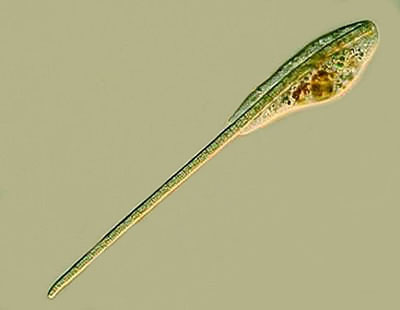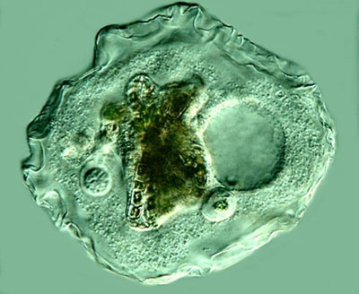 Another ambitious amoeboid feeder is a relatively wee critter, probably one of the smaller species of Mayorella, perhaps 30 to 50 microns in size, and either has “eyes bigger than its stomach” or a great deal of patience. I have seen specimens in the process of ingesting algal filaments 3 times its length producing quite a bizarre appearance.