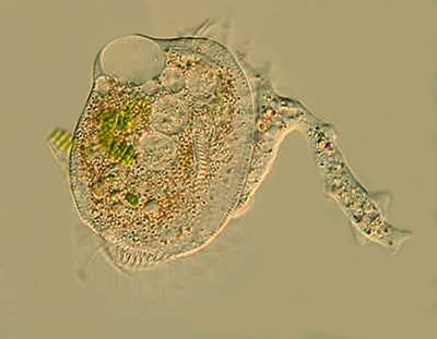 I was expecting algae, mostly Chlorella—not exactly a mover and shaker in the protist world—but, to my amazement, I found phytoflagellates, filamentous algae, hypotrichs, rotifers of the genus Philodina, Cyclidium, and at least 3 species of amoeba, including Thecamoeba. One of my first thoughts was: Where did all this stuff come from? How did it get into my bucket? Furthermore, this bucket is one which I use to sort marine organisms, which arrive preserved in formaldehyde, from a supplier in Maine. I rinse the bucket afterwards, but there must be chemical residues. This, perhaps is, simply another example of how extraordinarily adaptable many “primitive” organisms are. However, since I don’t believe in spontaneous generation, the question remains: Where did all this stuff come from?