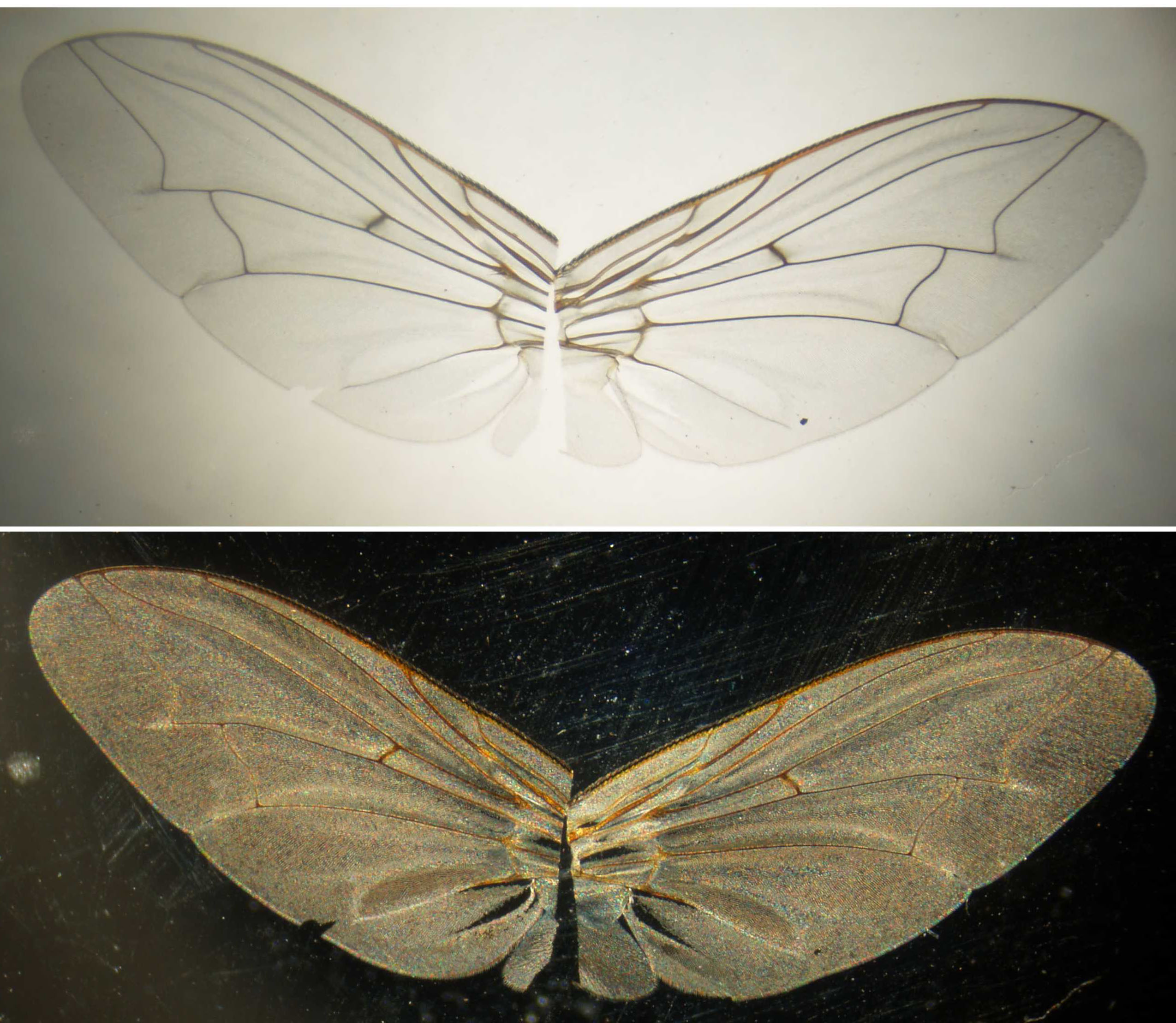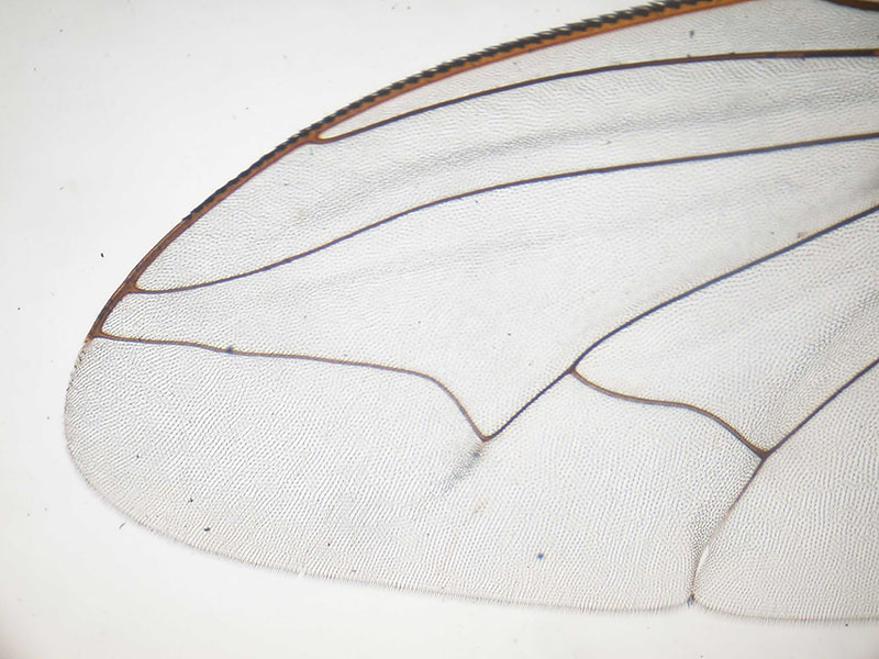 Photo 6 is a composite of the brightfield and darkfield images of the fly wings taken with a 0.5X reducer and the Meiji 2X objective. Some illumination unevenness is apparent towards the edge of the field. Photo 7 is a composite of the brightfield and darkfield images recorded using the Meiji 2X objective. Illumination is fairly even for this smaller field size. Photos 8 & 9 show the same wing in brightfield and darkfield recorded using the Meiji 4X objective. I am surprised to see the hair fringe resolved on the trailing edge of the wing was recorded. This fine detail is just resolved when viewing through the eyepieces. The tests indicated how well the critical focusing feature of the E-330 performs. The shutter vibration level is apparently minimal so that a very rigid stand is not needed for use with a stereo microscope. The photomicrography capability with the E-330 and my stereomicroscope is helpful but not necessary for me because both of my upright student microscopes have multimode illumination capability for 20X and 50X imaging with the E-330 mounted in my macro stand or on the enlarger stand. The modified Monolux microscope is described in my Microscopy Today article on rediscovery of darkfield dispersion staining. The dispersion staining image in that article of the entire field of Chrysotile asbestos on a reference slide was recorded with the drawtube mounted macro lens.
