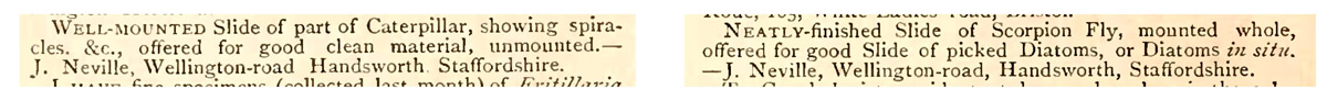 In addition to microscopical preparations, James Neville exhibited a wide variety of natural objects at meetings of the Birmingham Naturalists’ and Microscopists’ Union. On December 17, 1888, he showed the skin of a large Australian snake. This is probably the same specimen he advertised for exchange the following year “Offered, skin of snake, ten feet long. Wanted, exotic insects or offers”. He is also recorded as having exhibited tropical land shells, fossils in limestone, ammonites, “leaves of Spircea Ulmaria infested with brand”, and “a pansy with six petals, an abnormal growth that has been continued on all off-sets for several years”. Neville read several papers to the club, including “Peeps into Ponds” on Sept. 30, 1895, and “Protective Devices of Larvae” on June 26, 1899. Two other well-known microscopists also presented to the club during those years: Herbert Darlaston spoke on “Marvels of Insect Life” in 1895, and Richard Hancock delivered “A Short Review of Astronomy during the Century” in 1899. Brian Bracegirdle reported that Darlaston developed his skills as a microscope slide maker through instruction by James Neville.