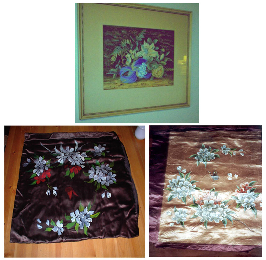 Figure 4. Artworks by James Neville. Top, framed painting. Bottom, two painted silk cushion covers. Photographs provided by Faith Blancquiere.