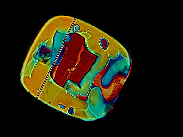 Here are three images of the diatom Etogonia using Nomarski DIC. The variation in colors between the 3 images is achieved by adjusting a prism in the body of the microscope to different positions.