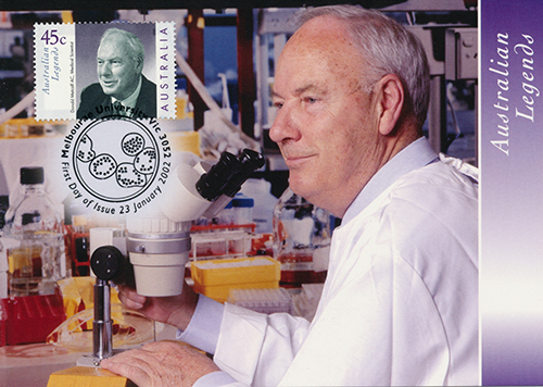 A card celebrating the life and work of Donald Metcalf who has carried out pioneering research in various areas of medicine, see Wikipedia entry. Excellent concordance. Card credits: 'The Walter and Eliza Hall Institute of Medical Research. Melbourne'.