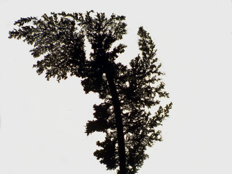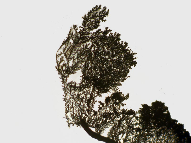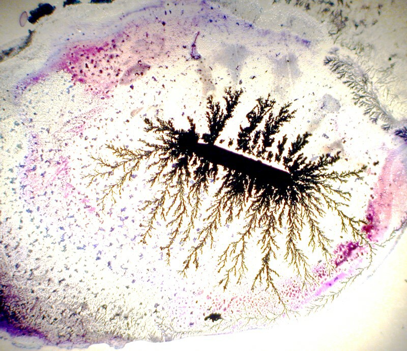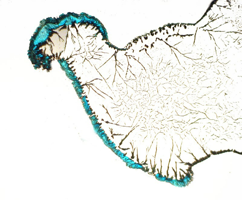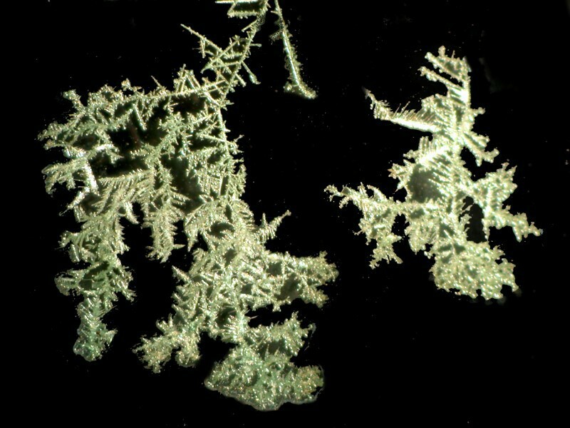 I then decided to try a double dose of copper by using a thin strand, but also adding a drop of copper acetate to the Silver nitrate drop on the slide. This produces some lovely effects. This first image is still very-tree like, but you will notice that in the upper left there is a greenish-blue tint from the acetate.