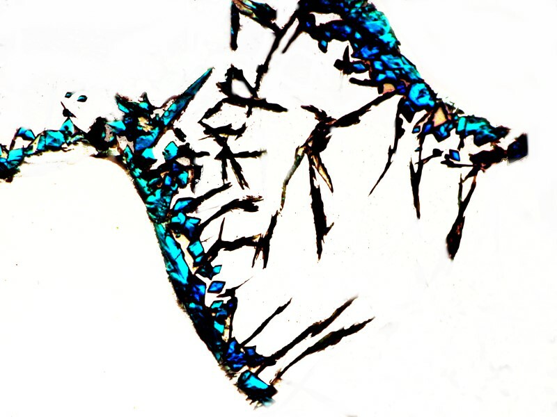 When observing with a typical brightfield configuration, the silver deposits usually appear gray to black in an oxidized form. However, a slight shift of the mirror to change the angle of illumination produces a distinct coppery color. The first image is brightfield, the second is at exactly the same point on the slide; the only difference is the shift of the mirror.