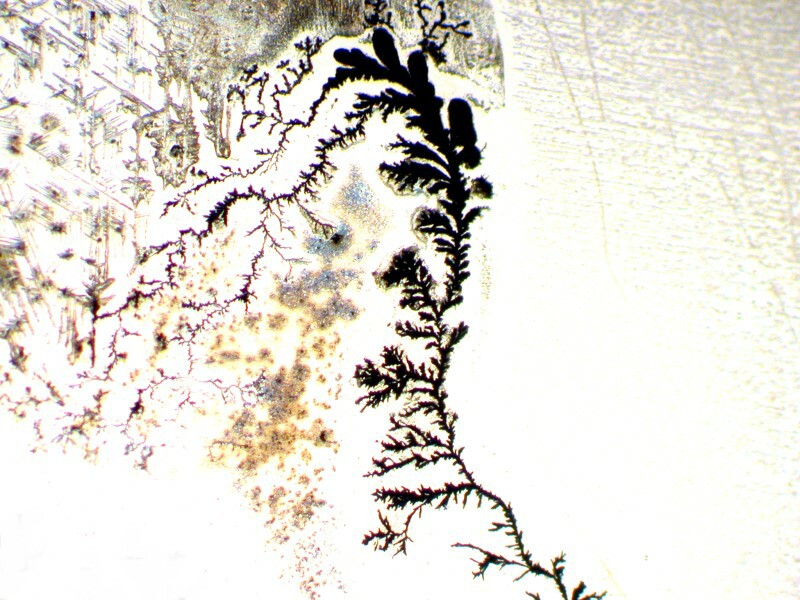 At yet a different location on the slide, we can focus on the silver dendrites and note that in the surrounding area the Copper acetate has created some pastel shadings.
