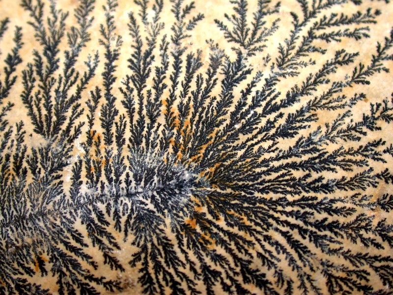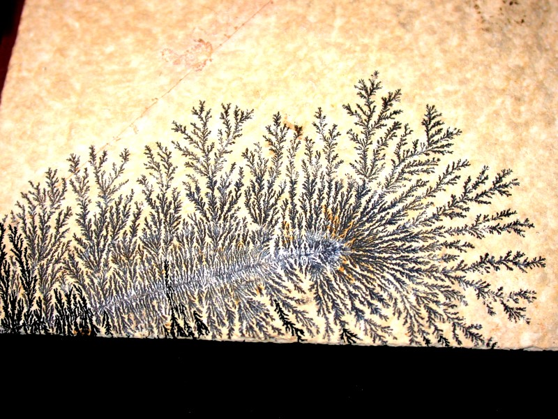 Finally, another kind of classic example is the dendrites found in certain types of agates and also on limestone. I’ll show you an example of dendrites on limestone formed by the deposition of Manganese oxide.