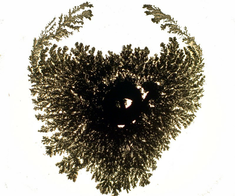 Out at the edge of a drop, the Copper acetate has crystallized and there are thin dendrites of silver extending through the central area.