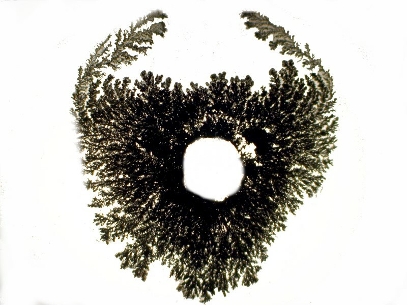 For the next image, I took one of the very fine extension cord strands and curled it into a miniature coil which I placed in the center of a drop of solution. The result produced a form that looks rather like a coat-of-arms or an escutcheon. The image after it is the same one after I removed the coil from the slide.