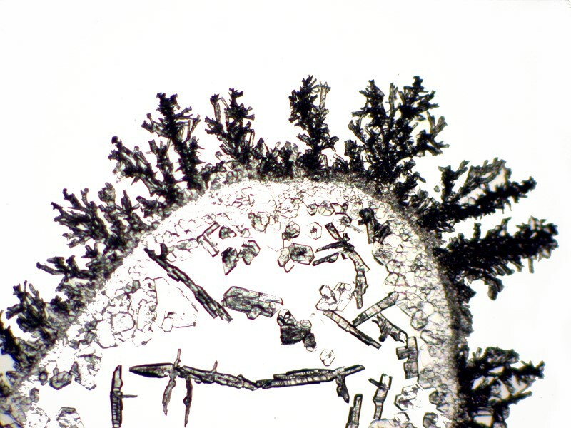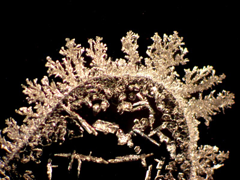 Using a very simple technique, you can produce elegantly beautiful patterns which are readily examined with a stereo-dissecting microscope. The only tricky part might be obtaining some Silver nitrate. However, there are some sources on the Internet which will sell small quantities of chemicals and that is ideal for the amateur microscopist who rarely needs more than a very small quantity. Another possibility is a friendly pharmacist who might be persuaded to make up a 1% solution of Silver nitrate for you. Silver nitrate does after all have medical and first-aid uses and is found in styptic pencils which is what you use after a night, like New Year’s Eve, of too many libations, when the next morning, you cut yourself shaving and need to staunch the bleeding.