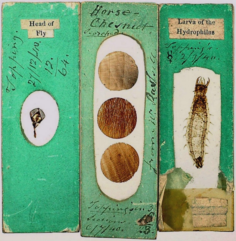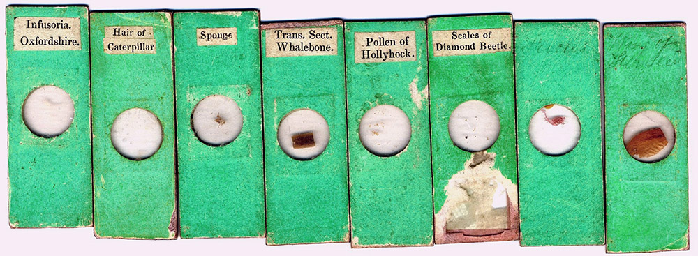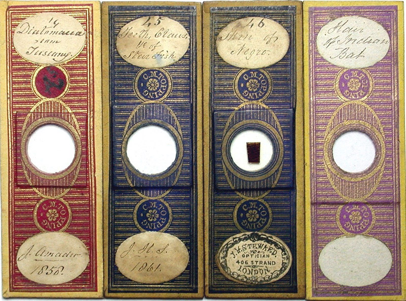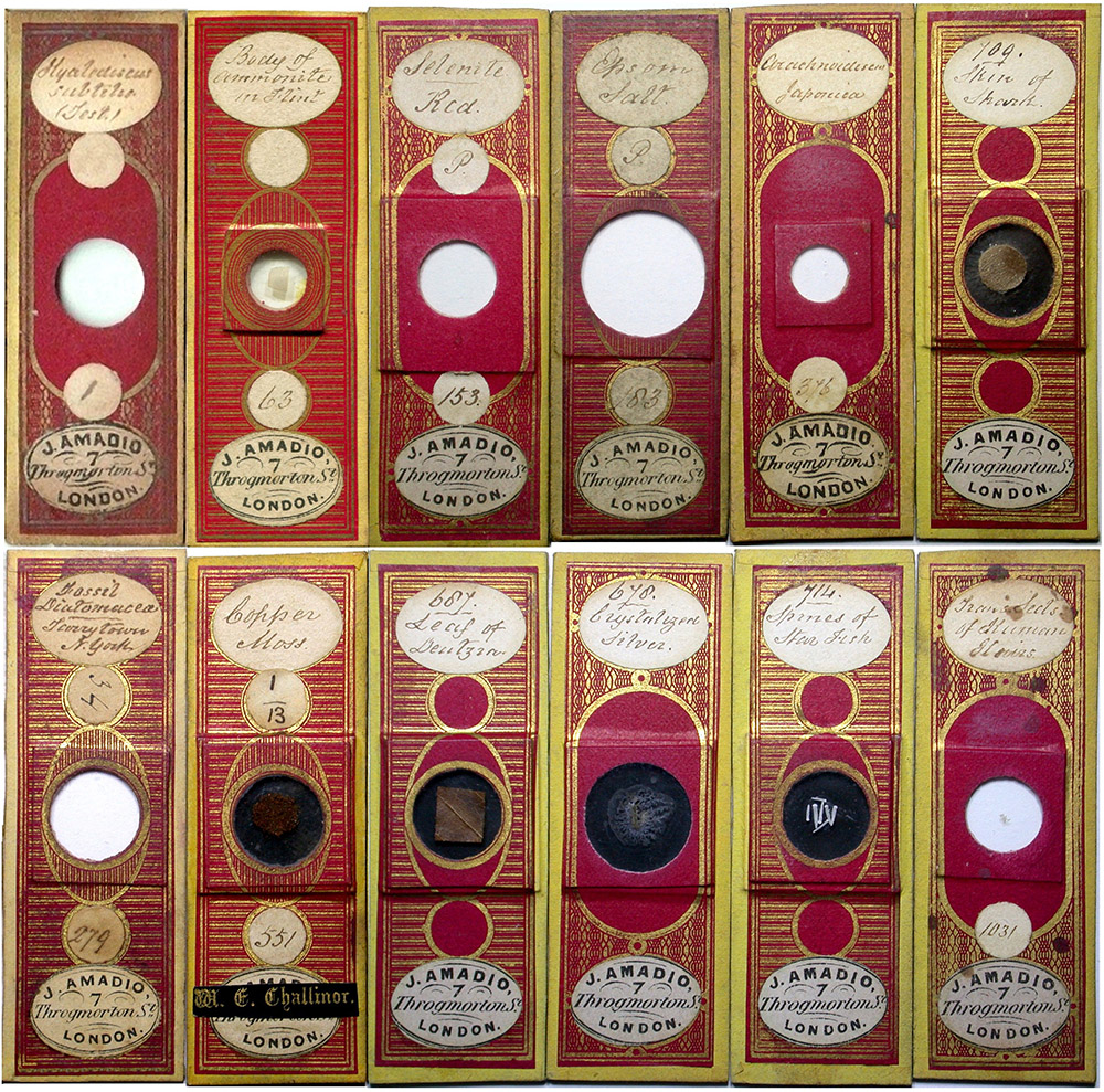 A selection of Topping slides that were sold by microscope retailer Francis Amadio. The slide numbers correspond to extensive numbered lists of specimens advertised in Amadio’s catalogues for 1858 and 1864.