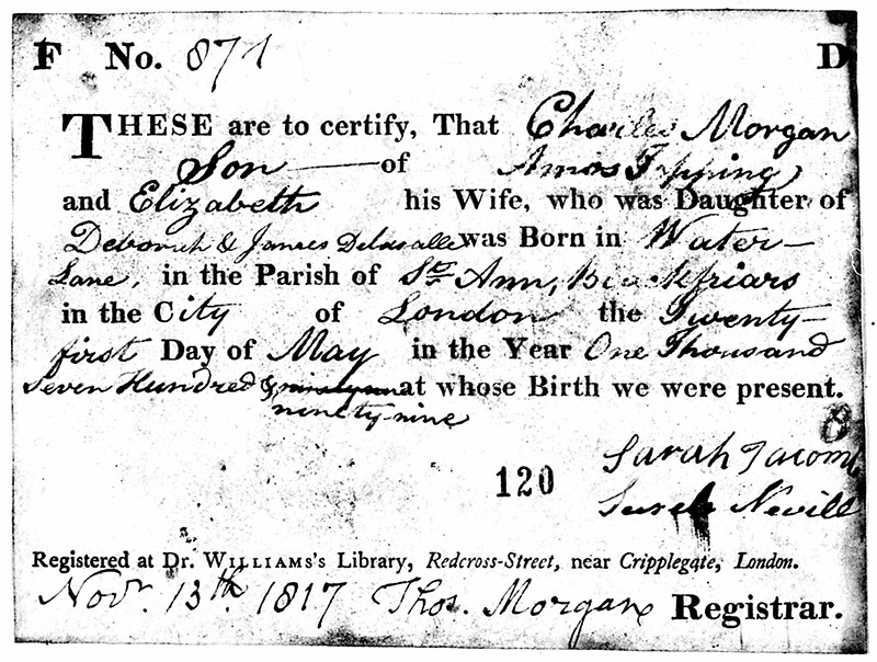 He married Elizabeth Dellesalle on September 24, 1786, at the parish church of St. Andrew Holborn, London. They had two daughters, born in 1788 and 1790. The first son, Charles Morgan Topping, was born on May 21, 1799 (Figure 25). Three daughters and another son followed.