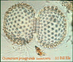 Cosmarium praegrande Lundell (1871). Several specimens were found in a sample from Rhiconich, Portle Vorchy, Sutherland in October 1993, This large species of Cosmarium is exceedingly rare in Britain. The dimensions of the Rhiconich specimens; Length 120 microns. Breadth 71 microns isthmus 26.5 microns; are larger than those described by W.&.G.S.West (1908). Also larger than those described and figured by Prescott et.al.(1981).