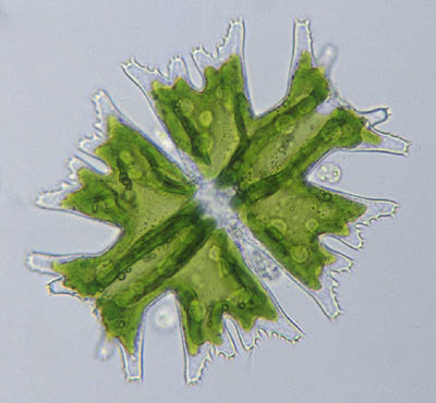 Microscopists have long been attracted by desmids. Their beautiful shapes, the intriguing ways of cell division and sexual propagation and the fact that many species are indicators of a special aquatic environment all contribute to that attraction. This gallery will introduce you to some of the most common types. Although desmids can be found in many shapes and sizes their basic design is mostly similar. They all have two semi-cells which are mirror images. We start with one of the most spectacular desmids. The species of the genus Micrasterias have beautifully ornamented protrusions. |