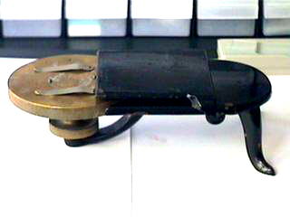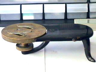 A metal form was later developed which made things much easier, one of which was given to me by Dr. Manuel del Cerro, editor of the Journal of the Microscope Historical Society, New York (see footnote 2). I cleaned it slightly to remove the years of dirt and dust only to find it was once nickel-plated as evidenced by the small patches still adhering to the brass table. The cleaning operation also revealed the hidden signature on the table: E.H. Griffith, Pat. Ap'd for, Fairport, N.Y. (No, this is not a spelling mistake on my part, the abbreviation 'app'd 'is actually written with one 'p' on the table).