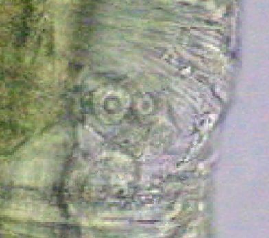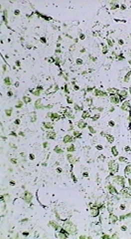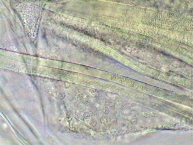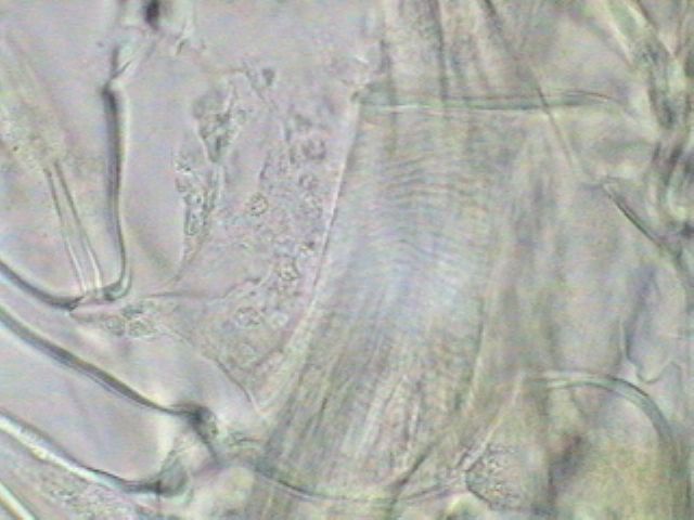 Pollen grains, objective x100. Cells of the ovary seen through the exoskeleton of a diaptomid copepod. Microwave oven.- Amateur microscopists who possess a kitchen microwave oven can find it profitable. In my 700W oven, 30 seconds of continuous radiation at FULL (100%) setting provides a fully charred slide. But a 10 - 15 seconds exposure dries it beautifully. Be aware of a curious fact. When you heat your slide, Karo becomes fluid, and if it is in a thick layer it can move under the coverslip displacing your subject. Make your preparations thin and give your slide many short periods of heat instead of a long one.