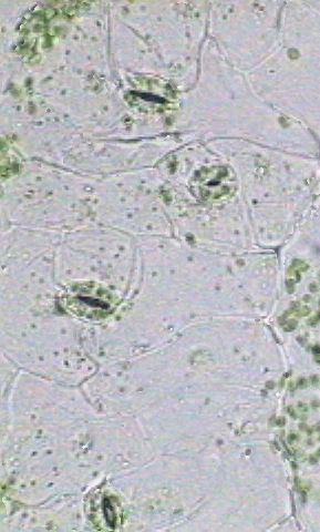 Epithelium from the underside of a leaf. (Objectives x10, x40, x40, x 100). Fixed for 12 hours in lactocupric fixative. The second picture is a montage in glycerin for comparison. All others were mounted in Karo, through 3 increasing concentration steps. The preparations were 14 days old. Note the good color conservation of the chloroplasts and cytological detail, including the cell nucleii. The above procedure is not as easy as it seems if you use concentrated mountant. Fructose, and almost all the other thick media, are dense enough to oppose the sinking of your subjects, and even of the coverslip. The first drop must be small and the object must be sunk with your tools to the bottom, to prevent unexpected and erratic displacements of the objects when the coverslip is applied.