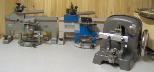 Microtomes. Background: sledge microtomes, foreground: a rotary microtome