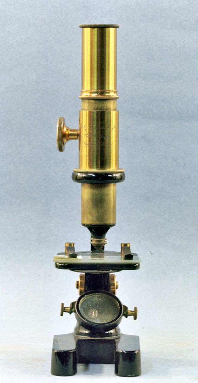 Microscope #448- Lutz, Ferrando y Cia., Buenos Aires, Argentina. Black and brass amateur monocular microscope. The horseshoe base is 15 cm long and 6.3 cm wide. Two 3.6 cm tall pillars are anchored to a low, circular plate that is attached to the upper surface of the base. The pillars clamp the arm at the junction point; a flat-head, brass screw adjusts the tension of the inclination joint. The inclination of the fork-mounted, plano mirror can be adjusted by means of small side knobs. The mirror is 2.7 cm in diameter. The rectangular stage is 5.8 cm wide and 6 cm deep. A diaphragm wheel is attached to the underside of the stage; it has three openings. The stage retains the two original stage clips. The arm is straight; it emerges at a forward angle from the back of the stage, raises 6.3 cm, and ends in a horizontally placed ring. A brass sleeve screws into this ring; it is signed in cursive with the legend “Lutz Ferrando y Cia 240 Florida Buenos Aires.” This sleeve holds the body tube and the rack and pinion for coarse focus. A side knob located on the right side controls focus. The body tube is 13.8 cm tall; it carries an ocular with no indication of magnification. A cone-shaped nosepiece carries a button-type, divisible, triple objective. The original wooden box is 27.3 cm wide, 9.2 cm tall, and 12.7 cm deep; it contains an ivory-tipped forceps and it has a small drawer for small size-slides. Provenance: Spectra Services, Webster, NY. Date: December 1998. Price: $125.00. OPTICAL PERFORMANCE: Element 1 of the objective operating alone provides a clear image free from curvature of field. Elements 1 and 2 together, provide a sharp image also with minimal field curvature. The field diameters are 2,5 mm for element 1, and 1,030 µm for the combination of 1 and 2. REFERENCES: 1) A nearly identical instrument was auctioned at eBay, item #251492834, on 2000 02 08. The highest bid had reached $177.00. The instrument was called a “Victorian English Microscope”. 2) Dingley (2002) refers to E(duard) Lutz as purveyor of microscopes in Paris during the 1872-1880 period. Could it be that he migrated to Argentina and established there the Lutz, Ferrando, & Cia optical firm? We do not know, and neither do we know if the Company had this instrument manufactured for then locally, or did they buy a generic instrument made for the trade in Europe and had it stamped with their names. Such a practice was not uncommon among the French and English retailers of scientific instruments.