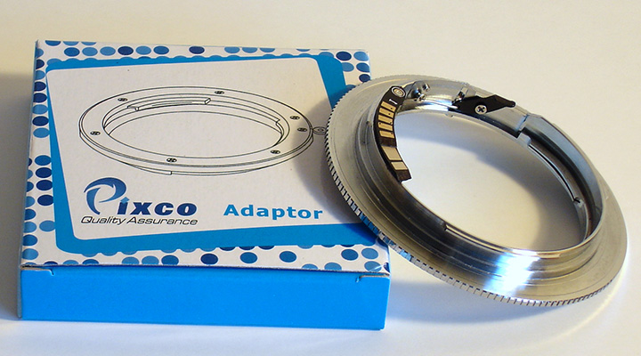 A typical Nikkor to Canon EOS adaptor, this one made by Pixco and widely available on eBay and elsewhere. A small electronics board with gold contacts makes the Nikkor lens compatible with the Canon EOS system. The black lever seen lifts the Nikkor lens locking pin when wish to remove the adaptor, but the adaptor remains firmly on lens if remove the Nikkor lens from the Canon body.
