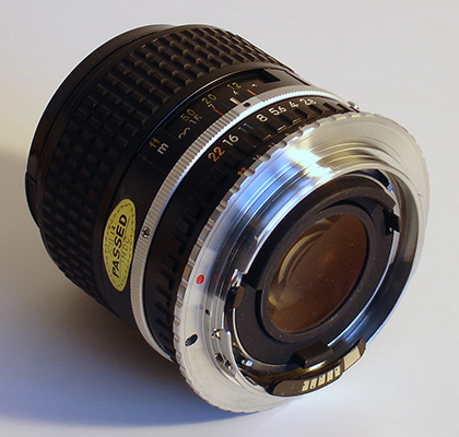 Left: The adaptor fitted to a Nikkor lens. Canon EOS does not use mechanics to transfer aperture indexing or set the lens f stop at exposure, but rather electrical contacts. The requisite electronics are part of the adaptor to allow a Canon body to meter in stop down mode.