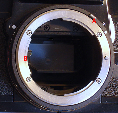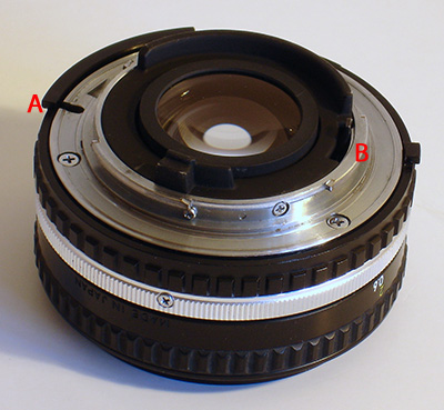 Left: A Nikkor lens without adapter. 'A' is the AI (Automatic Indexing) ring which transfers the aperture setting to camera body. 'B' is the lever that only stops down the lens to the required f stop at moment of exposure.