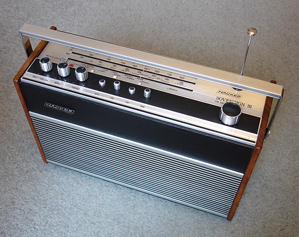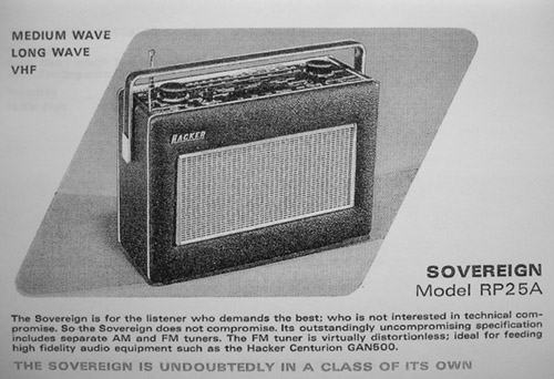 The beautiful Hacker RP72 Sovereign III LW MW VHF FM radio, introduced 1973. An even larger Super Sovereign with more features was also available. The list price in 1975 for the Sovereign III was £77.50 inc VAT, a lot of money for a portable radio!