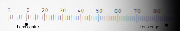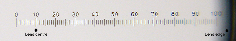 Above. Micrometer slide 0.1 mm scale. Lens 2 (9X) chromatic aberration remained modest but image quality fell off from centre more rapidly.