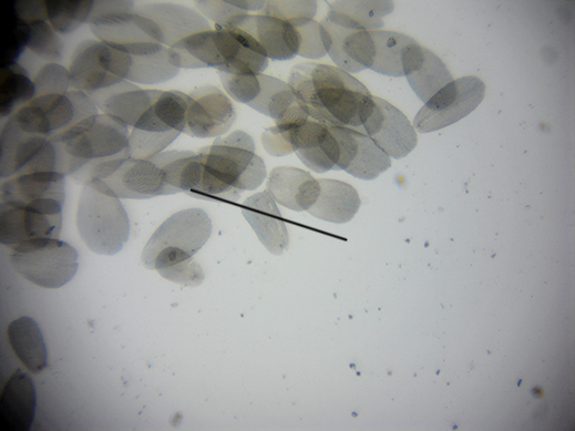 Above: Full field of a strew of Lepisma scales(Biosil slide) using the lens 'B' (45X). The bar shows the three scales selected for resolution studies. |