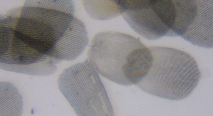 To assess the NA of the lowest power lens number 3, the 'Scale of Sole' subject supplied on the slider proved useful because of its ridges were coarser than the Lepisma scales.