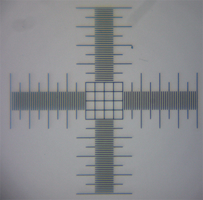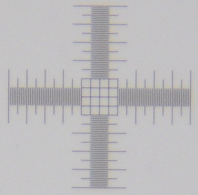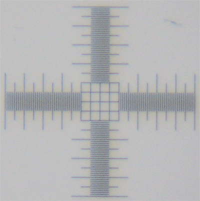 Above. Micrometer slide 0.1 mm scale. Lens 3 (12X) chromatic aberration remained modest but image quality fell off from centre more rapidly. |