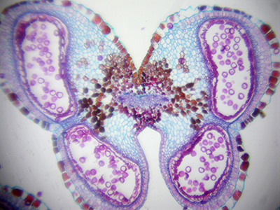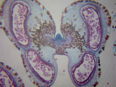 Lens 1 as single lens. Madagascan flamboyant tree, Delonix, flower-bud, T/S (Biosil slide). Although a modern stained plant thin section, it's a useful subject to compare the merits of using the compound head. |