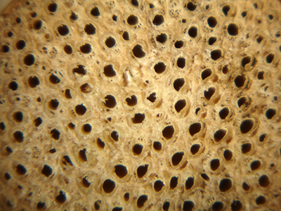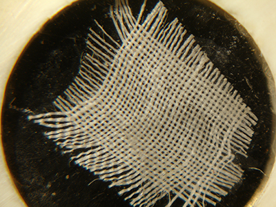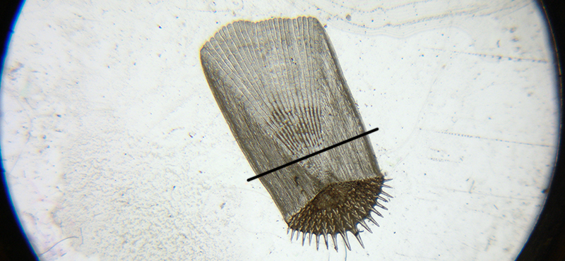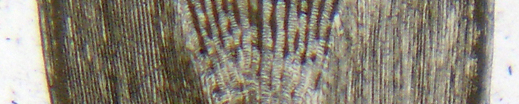 Above: Full field of view of the 'Scale of Sole' using lens 3 (6.5X), the lowest power. The fine ridges on left of scale along line were measured using the photomicroscope as being ca. 21.5 µm apart.