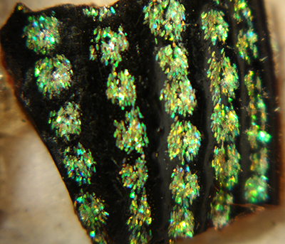 'Bit of Diamond Beetle'. The iridescent scales on the elytra of the S. American diamond beetle (Entimus imperialis) was a popular prepared slide subject throughout the 19th century (see this Micscape article). The scales are crisper visually. |