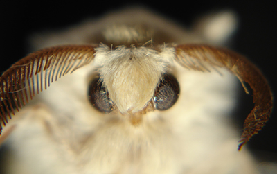 Head of the cultivated silk moth, Bombyx mori (own sample). The camera does not accurately reflect the crisp visual image seen. |