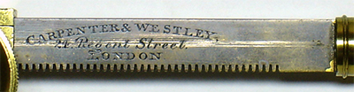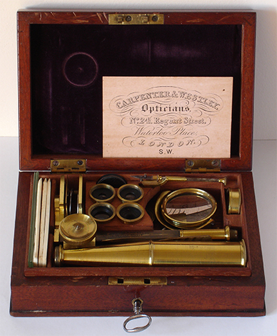 I've only been fortunate enough to handle and study this example, but from published illustrations, Cary-Gould style microscopes can vary in their box size and included components. The quality of the woodwork also varies. This example sold by Carpenter and Westley features one of the larger mahogany boxes, making it portable rather than truly pocketable. Typical of this design, the components are neatly compartmentalised in the box and has a pad of purple velvet in the lid. The carpentry is to a high standard in this example with pinned dovetail corners. Box size - 170 x 117 x 48 mm. The height of the microscope remains fixed because it has the typical moving stage focus. It has a lock rather than the more commonly seen two clasps. The only other example have seen to date with a lock is another Carpenter and Westley shown in the Golub Collection (which has both lock and clasps and differs on other features, e.g. a pivot at base of pillar). The tray lifts out which allows access to all components while the microscope is mounted on the box. The space below the tray allows some storage of paperwork, in this case the leaflet and trade card. The rack is marked 'CARPENTER AND WESTLEY, 24 Regent Street. LONDON.' They are a well known company and dates the microscope from ca. mid 1830s. It may have been made for them (see Resources below for a history of the company and the link above). |