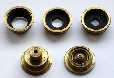 Five lenses were included, shown right, in increasing order of magnification. The top row numbered 3, 2, 1 had bi-convex lenses for lower powered work, were still intact and optically clear and were in excellent condition after a thorough clean. Sadly the high power lens element in the screw fit brass cell (2nd row on left, shown inverted) was missing which was for use with the compound head only. An optical diagram in Savile Bradbury's 'The Evolution of the Microscope' (page 173) of a typical Cary model ca. 1830 suggested this was likely a small plano-convex lens, so I may replace with a modern equivalent. The accompanying maker's leaflet stated it had an (area) magnification of 8,000 times, i.e. 89.4 linear. There was included a button style high power spherical lens ('B', 2nd row, shown inverted right) for use without the compound head. This lens may have been added later because the thread didn't fully match the lens mount. All the optics were extremely dirty on receipt. As they were uncoated single glass elements, they were soaked in their housings in deionised water with a trace of detergent and left for 15 minutes. All dirt then readily floated off with the light action of a fine brush while inspecting each lens under the stereo while still immersed. This procedure avoided the potential danger of any gritty dirt scratching the glass surfaces. |