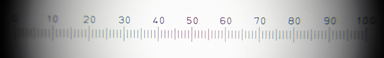 Above. Micrometer slide 0.01 mm scale. Button lens 'B' (45X). The scale covers almost the entire field with near undistorted field with little chromatic aberration and shows a useful performance for smaller subjects. |