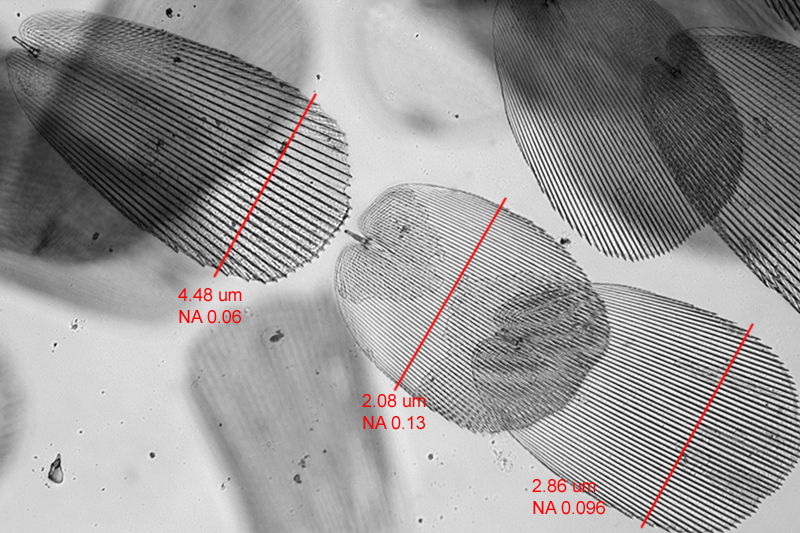 Estimating numerical aperture For the low NAs of these type of lenses, the classic test objects such as diatoms are unsuited and I don't own a rulings type test plate. A 0.01 mm micrometer slide is a useful start to show if the NA is greater or less than 0.028 (using R=λ/2NA at 550 nm). After browsing around my prepared slides, a strew of Lepisma saccharina (silverfish) scales proved useful as the coarse ridges vary quite widely in separation and also are non-parallel. This allowed three scales to be selected that required NAs of ca. 0.06, 0.096 and 0.13 to resolve the ridges. For the lowest power lens no.3, the finer ridges on the 'Scale of Sole' subject on slider included was useful which required an NA of 0.013. (See Appendix.)