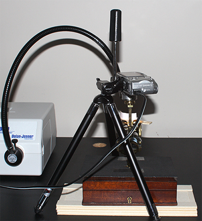The above set-up was unsuited for top lighting studies because the stand collar blocked light access. The set-up right was used instead allowing a cold light source (30W) to be used, with some modelling using a small crescent of paper on the stage. The disadvantages of this set-up was that setting the vertical height of the camera was awkward and not readily altered. Access was also limited by the tripod legs. The rubber mat placed on the box for both set-ups was a safety precaution because standard 3 x 1 inch slides when in use did not sit in the sprung clips and had to sit untethered and more precariously on top of the stage. For transmitted work above the supplied mirror was somewhat undersized for evenly filling the field, so a Russian LOMO convex mirror was temporarily placed on top (it had a similar focal length to the original). |