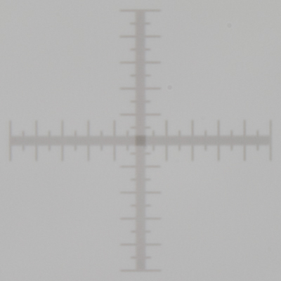 Right. Detail from the same image right above using the button lens 'B'. From the calibration image in the Appendix, the lefthand and righthand scale ridges are resolved but not quite the centre (confirmed visually, the camera was not the limiting factor nor the tricky focussing.) This suggested that the NA of lens 'B' was >0.096 and <0.13 and likely closer to the former. |