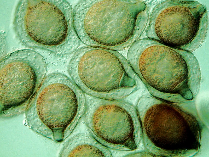 Gonium sociale is an example of a colony of four and there are other protists with 3, 8, 12, 24, 48, and on up to thousands of “cells” in Volvox globator. The larger “wheel” or sphere colonies of flagellates are extraordinarily striking as they gyrate through the water. Sometime you see a brownish spherical colony rotating through the water and as you track it, you may very well come across a brown, branched ropy-looking “tree” with the very same sort of colonies attached to the outermost tips of branches. This is Anthophysis vegetans and though I have encountered it numerous times, I am still completely puzzled regarding how these organisms secrete, produce, and construct their “tree”. Here you can find some images of this bizarre organism.