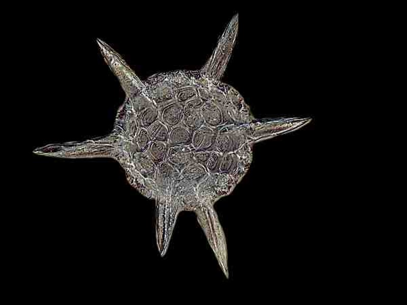 Amoebae tend to be the real builders. Forams build elaborate, chambered, calcareous tubes or lovely spirals and some even look like Belleek vases. Radiolaria are the aristocratic architects of the micro-world. They extract silica (essentially, glass) from seawater which is a rather amazing feat to begin with and then they create phantasmagoric “mansions” in the form of spheres, “space capsules”, pyramids, and wheels, all of which are punctuated with hundreds of pores, allowing for the projection of protoplasmic pseudopodia to create a series of organic nets which are very effective at capturing prey. However, most of us are generally able to view only the tests or “shells” which are in themselves minor miracles of nature.
